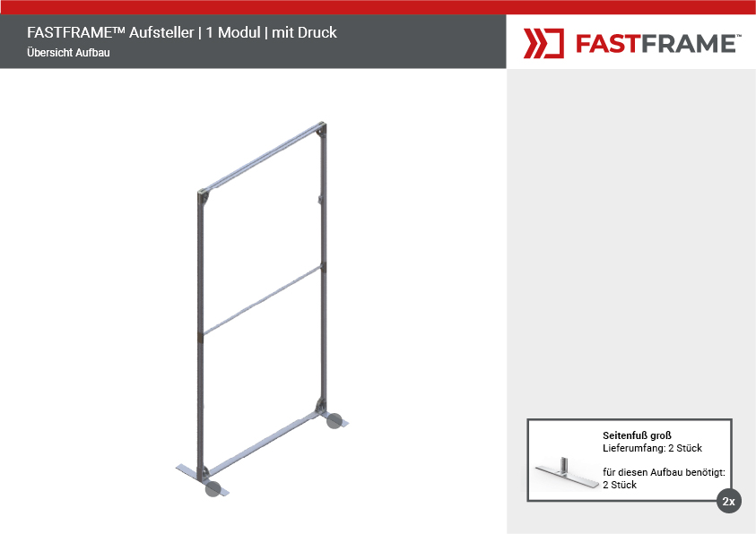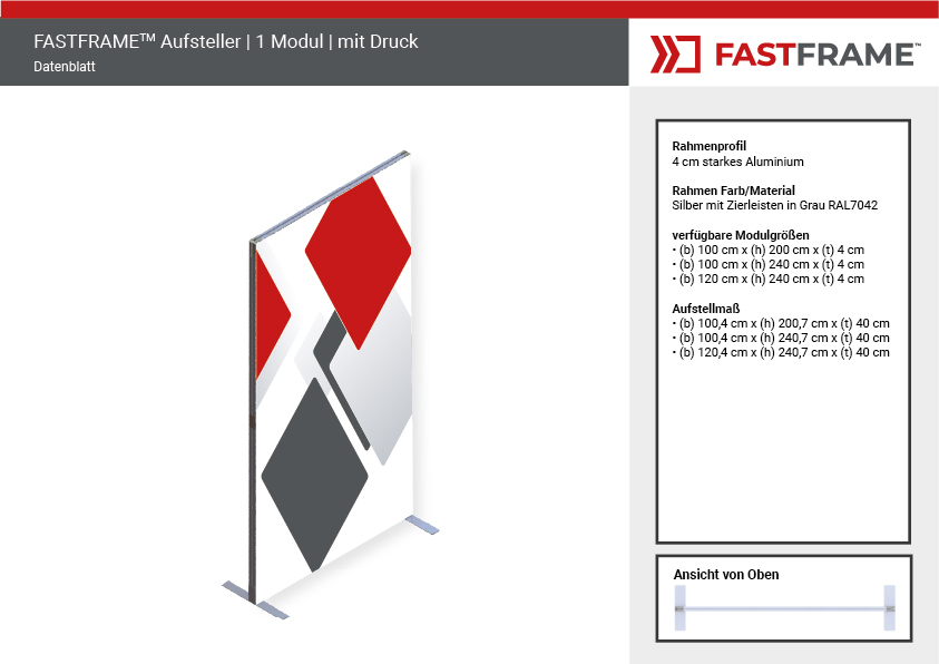 Der FASTFRAME™ Aufsteller ist die ideale Lösung für professionelle Präsentationen, Messen und Events. Dank seines leichten, vormontierten Aluminiumrahmens mit 40 mm Profil lässt er sich in Sekundenschnelle aufstellen – ganz ohne Werkzeug. Eine zentrale Stützstange sorgt für zusätzliche Stabilität, während optionale Standfüße den Halt optimieren.