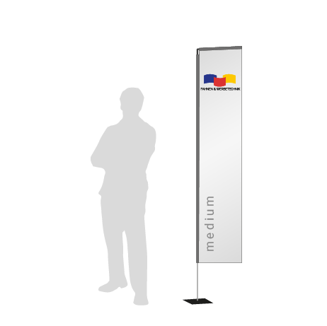 Für die Fahne sind zudem verschiedene Standfüße erhältlich, damit auf jedem Untergrund ein stabiler und sicherer Stand ermöglicht werden kann - egal ob Asphalt, Rasen, Sand oder Schnee. Soll die Fahne auf dem Boden stehen, so kann zwischen Kreuzfüßen, Bodenplatten, Wassertank, und KFZ-Fuß gewählt werden, mit einem Erdspieß hingegen kann die Fahne im Boden verankert werden. Um die optimale Standfestigkeit zu gewährleisten, kann bei der Verwendung eines Kreuzfußes oder einer Bodenplatte zusätzlich ein Wasserring zur Beschwerung verwendet werden.