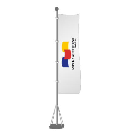 Der Standfuß der Fahne ist ein hohler Plastikfuß. Dieser kann mit Sand oder Wasser gefüllt werden und sorgt dann für eine gute Stabilität und Standfestigkeit. Der Fahnenmast gewährleistet eine Standfestigkeit bis zu einer Windstärke von 4 (ca 18-24 km/h). Im leeren Zustand ist er allerdings sehr leicht und somit gut zu transportieren, zudem kann er in vier Teile zerlegt werden, was den Transport noch leichter macht.