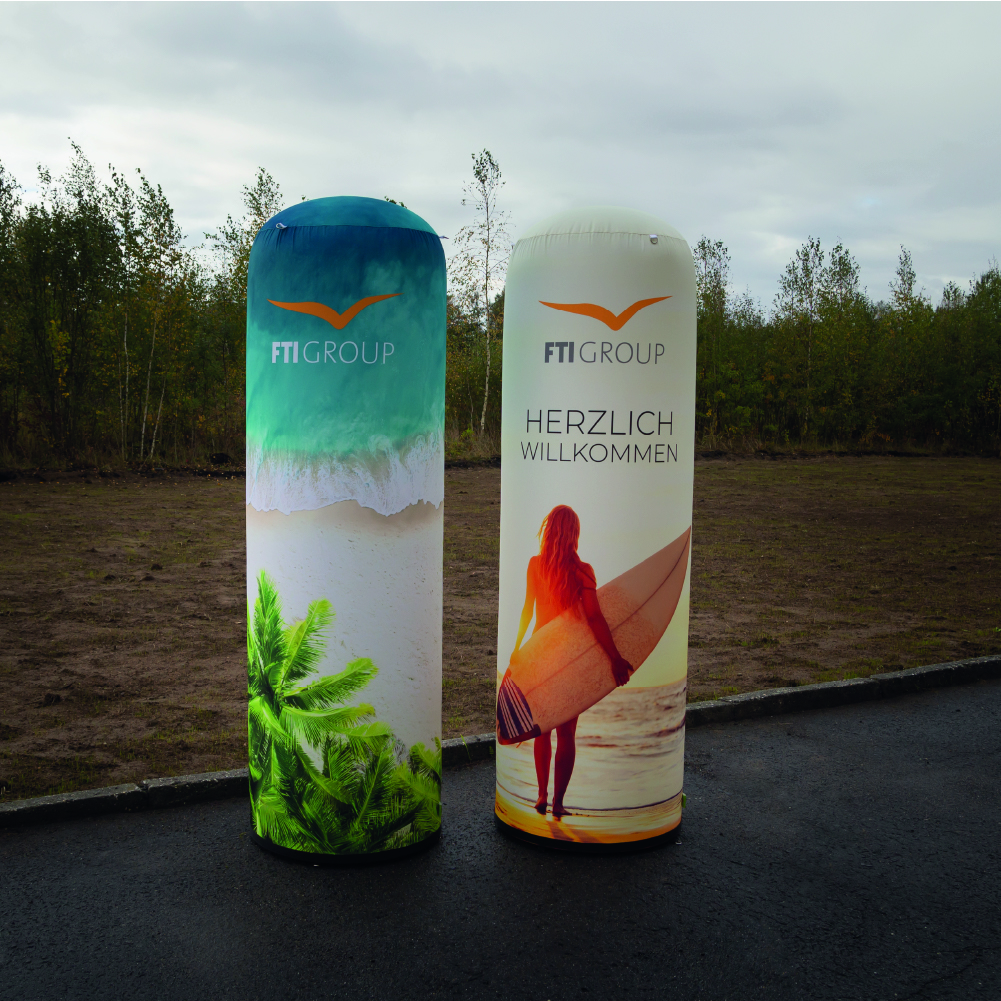 Unsere beeindruckende pneumatische Werbesäule mit einem Durchmesser von 67 cm und einer Höhe von 300 cm. Diese aufblasbare Säule ist perfekt, um Ihre Marke auffällig zu präsentieren. Wählen Sie optional eine LED-Beleuchtung aus, um Ihre Botschaft auch nachts strahlen zu lassen. Für den schnellen und einfachen Aufbau bieten wir eine Handpumpe oder elektrische Luftpumpen an. Jede Säule wird mit einem Ihrem individuellen Druck versehen, der Ihre Marke optimal in Szene setzt. Ideal für Messen, Events oder Promotionen – machen Sie mit unseren Werbesäulen einen unvergesslichen Eindruck!